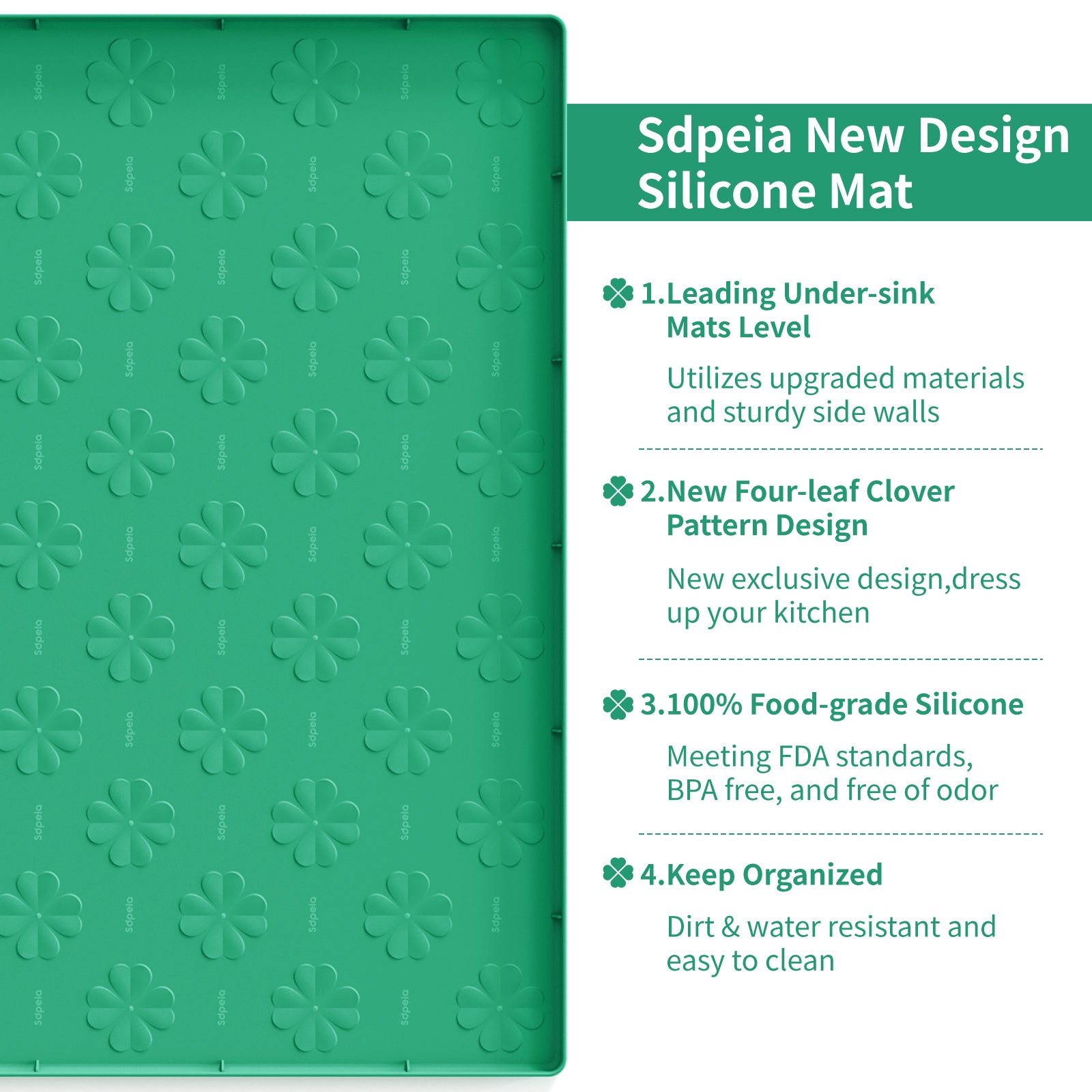 - Premium Under-Sink Mat Design: Experience the Sdpeia silicone under-sink mat, crafted with advanced technology, upgraded materials, and sturdy side walls. Made from 100% food-grade silicone, this mat combines safety and functionality with a sleek, modern design. Available in 8 patterns, sizes, and colors, our soft and flexible kitchen sink mat saves valuable storage space compared to traditional hard mats.